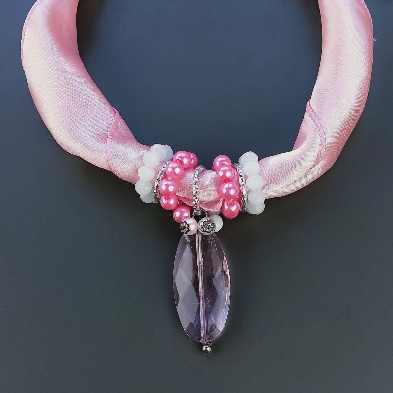 Collana foulard rosa con ciondolo di cristallo forme miste